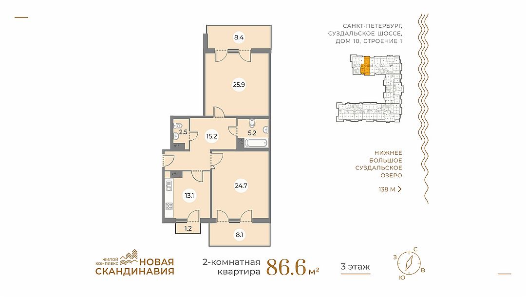 Уютный клубный квартал располагается в прекрасных экологических условиях – на берегу Нижнего Большого Суздальского озера, рядом с зелеными массивами Новоорловского природного заказника и исторического Шуваловского парка.