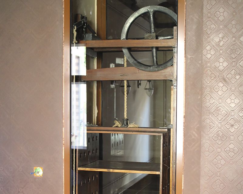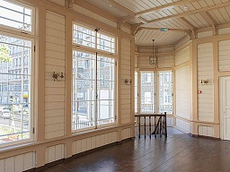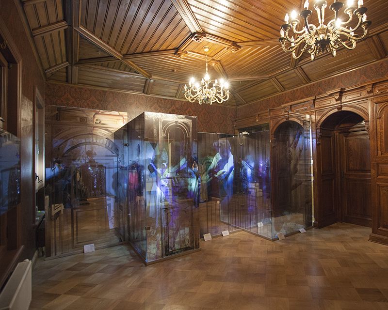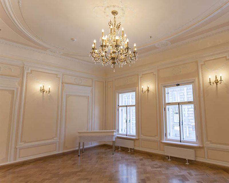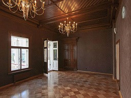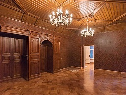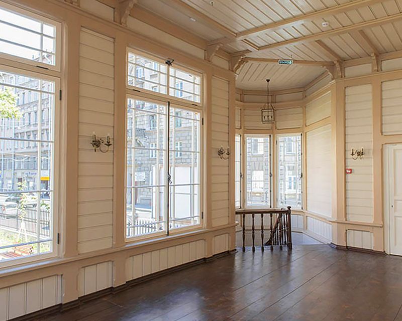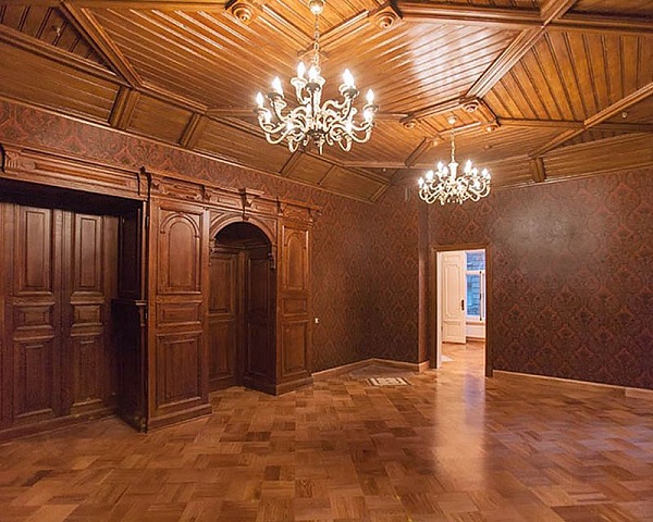 Исторические интерьеры здания были полностью восстановлены. Комплексной реставрации подлежали входная зона, помещения первого этажа и веранда. В ходе работ был сделан ряд интересных находок. В частности, в одной из стен обнаружен подъемный механизм, использовавшийся для подъема пищи из кухни в столовую. Кроме того, под многочисленными покрытиями полов были найдены предтопочные плитки. Самой значительной находкой стали фрагменты обоев, выполненных в технике «линкруста» и относящихся приблизительно к 1896 году. Ввиду невозможности полного воссоздания таких покрытий и в целях их максимальной имитации была разработана специальная технология многослойной трафаретной печати на холсте с последующей ручной росписью.